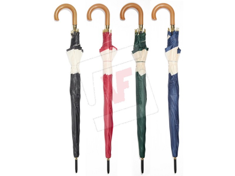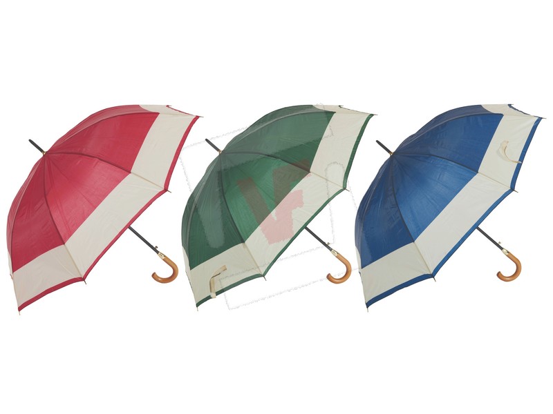 Apertura automatica a pulsante, facile e comodo da utilizzare, tessuto resistente, impugnatura color legno, colori assortiti con fascia beige, lunghezza cm. 90 (chiuso), Ø cm. 113 (aperto).
