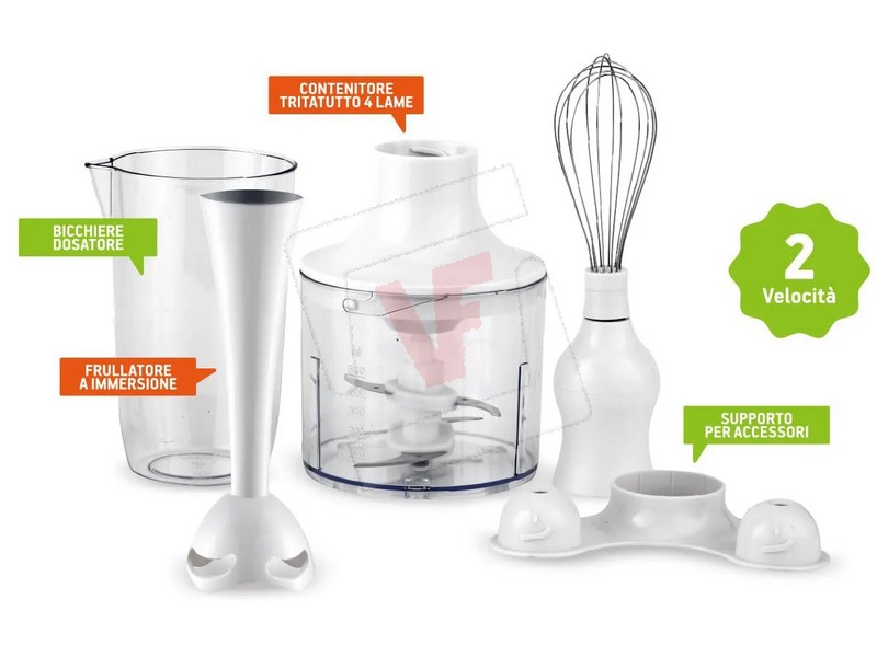 Design compatto, multifunzione 3 in 1 (frullatore-tritatutto-frusta) 2 velocità, lame in acciaio inox, impugnatura ergonomica, facile da lavare e pulire, ideale per tagliare, tritare, sbattere e schiacciare ogni tipo di cibo, cm. 20x14x24 h. In dotazione: frusta emulsionante in acciaio inox, accessorio tritatutto ml. 500, bicchiere dosatore ml. 650, supporto per accessori.
