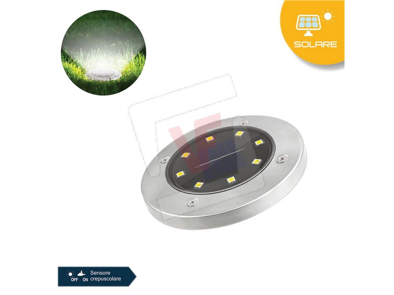 ABS body, 8 LEDs 0.2 W (10 lumen), autonomy 6-8 hours, integrated rechargeable battery, IP67 protection, twilight sensor, Ø cm. 11.5x2 h, picket cm. 10.