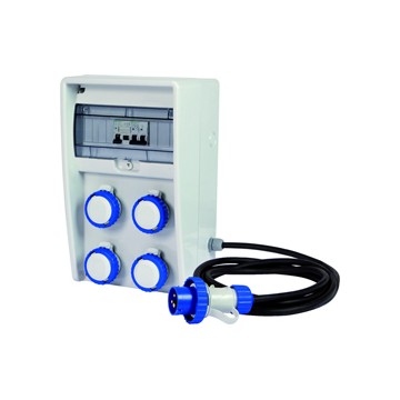 ASC panel, IP55, 2P+E 16A 220V plug, 4 2P+E 16A 220V sockets. Protection: differential/magnetic circuit breaker 10A 30mA. Cable mt. 2, col. light grey.