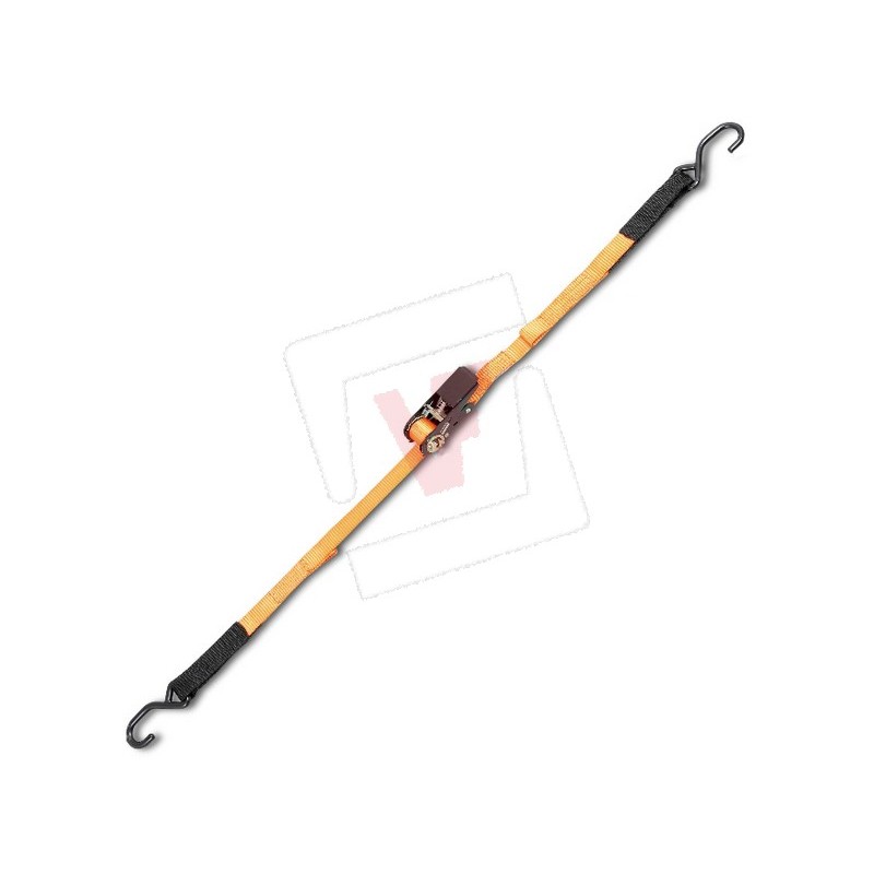 Tying systems with 2 hooks and eyelets, tension ratchet (work load 375 kg), high tenacity polyester tape (PES), safety factor 2:1, in compliance with EN 12195-2.