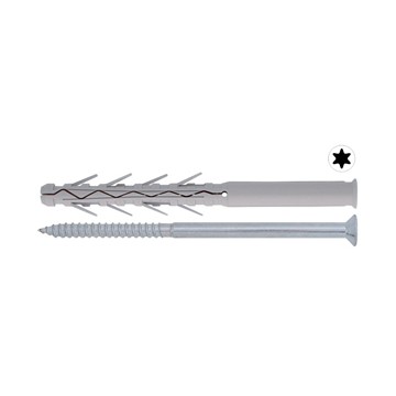 In nylon, with anti-rotation edge and fins, TPS screw in white galvanized steel with Torx imprint, extended type, for heavy fixings.
