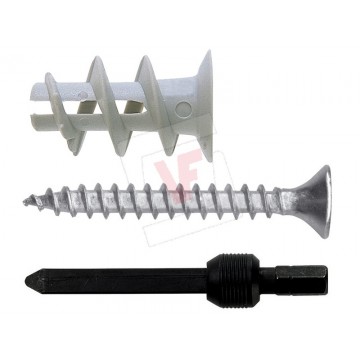 In nylon, with zinc-chromed steel chipboard screw, pozidrive TSP recess, with mounting accessory (1 pc. per pack). Ideal for quick installations without the use of additional tools, short length, suitable for plasterboard, panels and sheets.