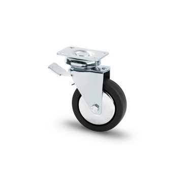 In rubber, chromed steel support rotating on a ball crown, bolted axle, with wheel and plate locking.