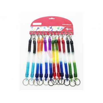 With carabiner and ring, colored plastic spiral cable (6 assorted colours). Display stand with hanging loop.