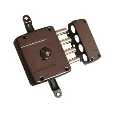 Double bit lock to be applied. 4 throws, 3 locking points, 2 diverters, stud, without rods, 3 keys, anti-drill protection, bronze painted.