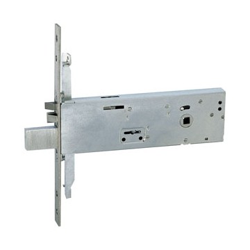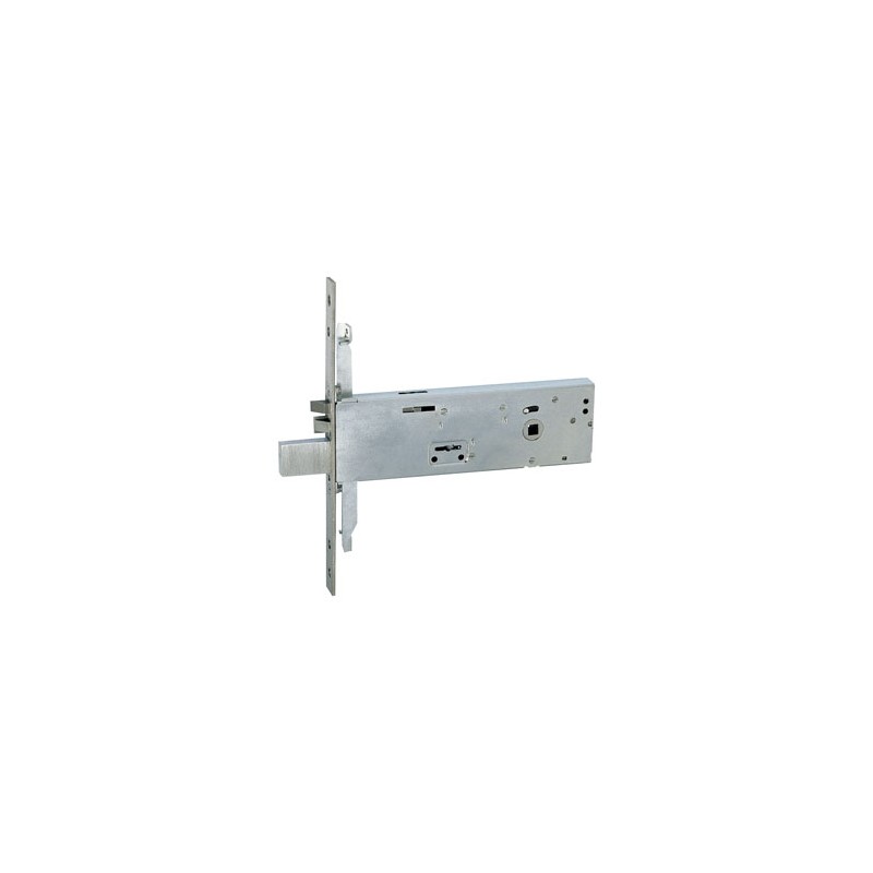 Double bit mortise electric lock for bands. 4 throws, triple, screw rod connections, separate reversible and adjustable latch, stainless steel front, 3 keys, box mm. 206x64, voltage 12 V approx.