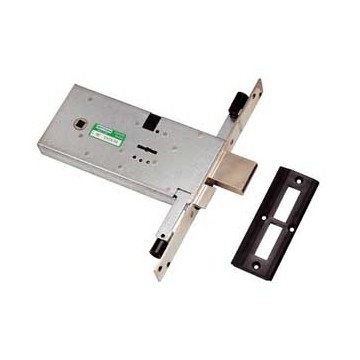 Double bit mortise lock. 4 throws and latch, 3 locking points, half turn operated by handle square, threaded rod connection, 1 escutcheon + 1 floor striker, 2 keys, box mm. 182x82.