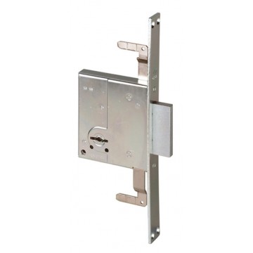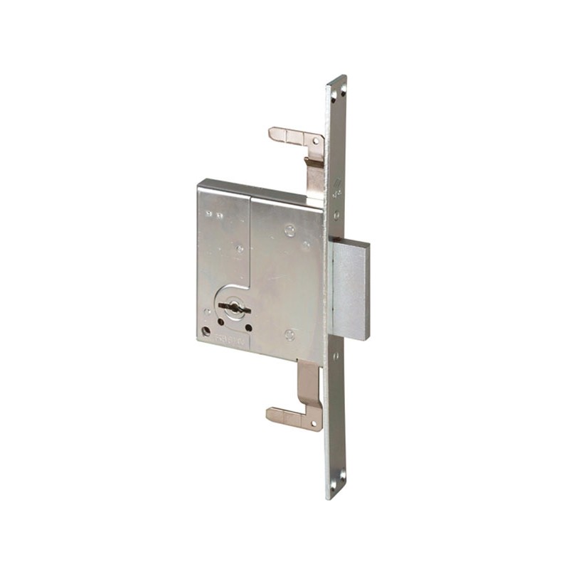 Double bit mortise lock. 2 throws, 3 locking points, keyhole cover to be welded, without rods, 2 bushings (M8), 2 keys, galvanized, boxes mm. 76x93.