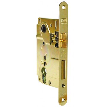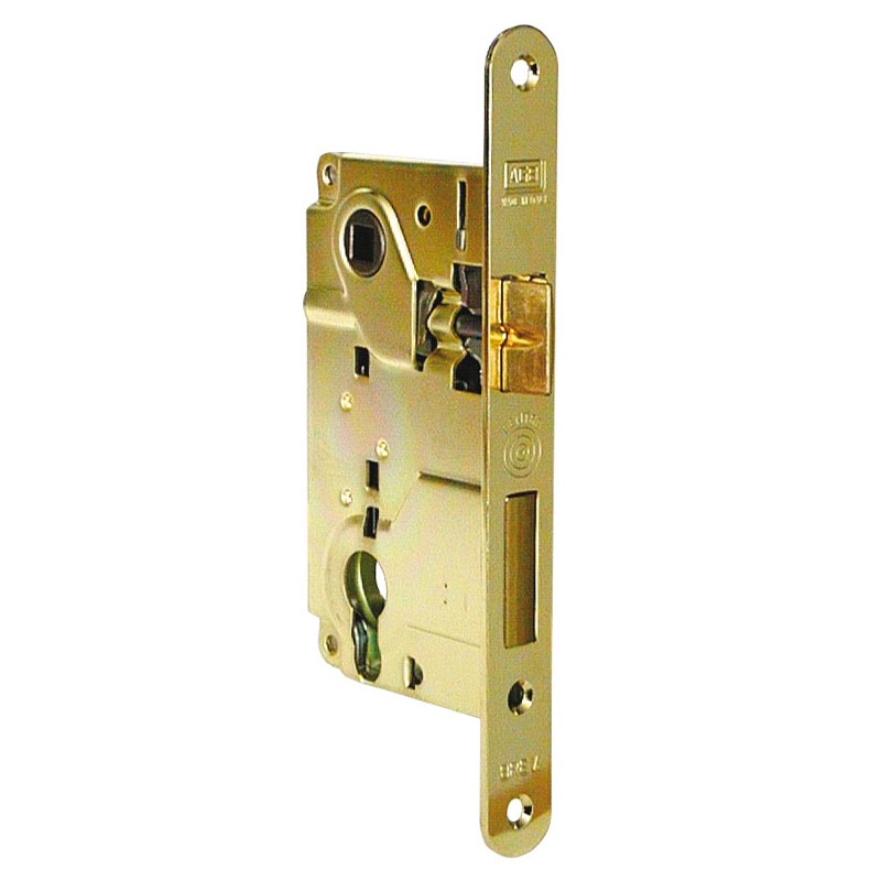 Mortise lock. 2 throws and latch, in painted brass-plated steel.