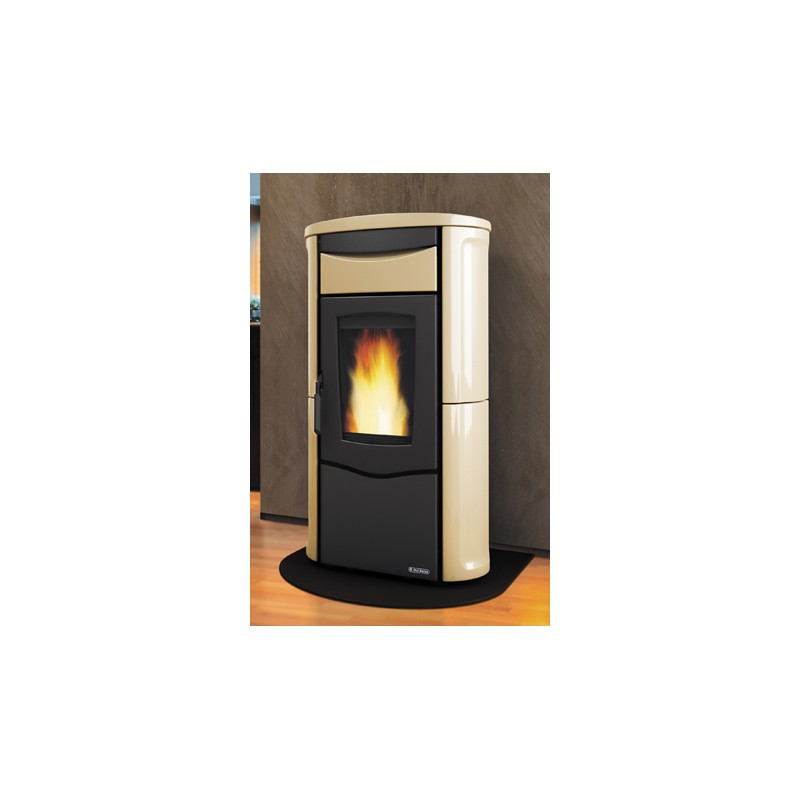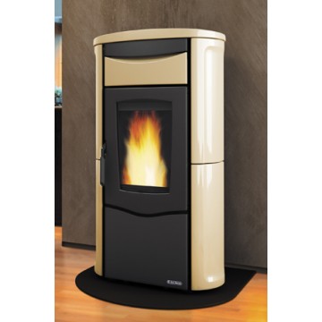 Majolica cladding, fire-view ceramic glass, circulation pump and expansion tank, Ø smoke outlet mm. 100, remote control and chronothermostat, thermostat and safety thermostat, provision for external thermostat, forced ventilation, daily and weekly programming.