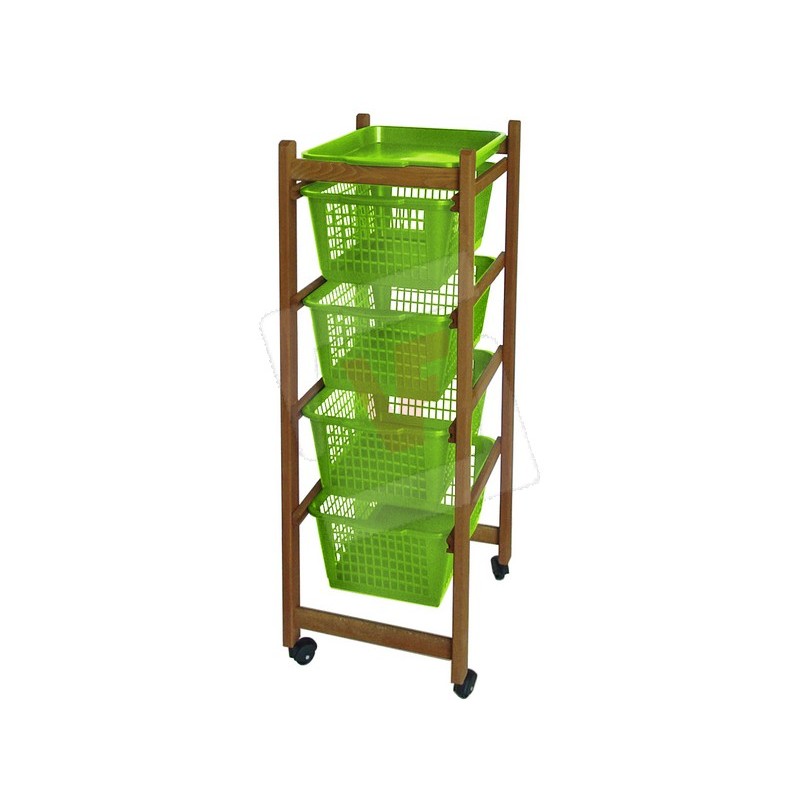 In dark solid wood, with 5 shelves (4 baskets + 1 tray), with swivel wheels, suitable for food, col. assorted.