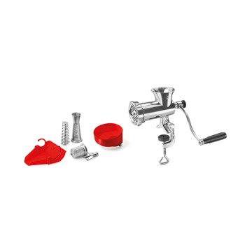 Body, propeller, ring nut, plate, knife and crank in stainless steel. Complete with tomato squeezer set, vegetable mill set, almond crusher and cheese grater.