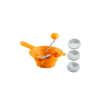Plastic body with stainless steel details, 3 interchangeable filters. Ideal for vegetable purees.