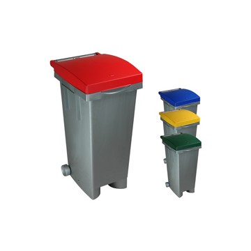 Made of polypropylene, colored lid, with wheels.