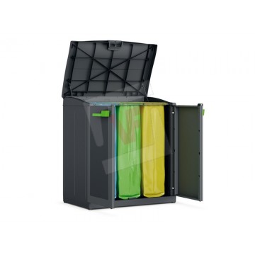 Made of resin, 2 front doors, 3 separate compartments, internal steel frame, top and front opening, metal hinges, handles in 2 color options, UV resistant, lockable, ideal for separate waste collection.