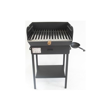 Stainless steel grate adjustable in 3 positions with sauce collection channel, sauce collection bowl, wind screen, ash drawer, shelf.