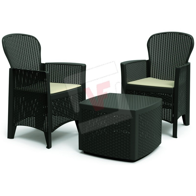 Lounge set in rattan effect polypropylene, resistant and long-lasting, cushions included. Ideal for both exterior and interior. Composition: 2 armchairs (cm. 60x58x85.5 h), 1 coffee table (cm. 53x53x40 h).