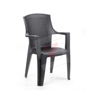 In rattan effect polypropylene with anti-scratch film, resistant and long-lasting, stackable, high backrest.