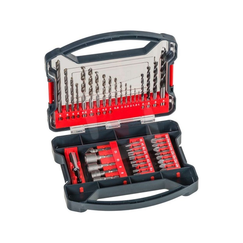 Ultra-resistant plastic case with integrated handle. Chrome-vanadium bits and bitholders. Box composition: 16 mixed bits, 4 bits with depth stop, 1 magnetic bit holder, 11 metal bits, 4 masonry bits, 4 wood bits, 1 wood countersink.