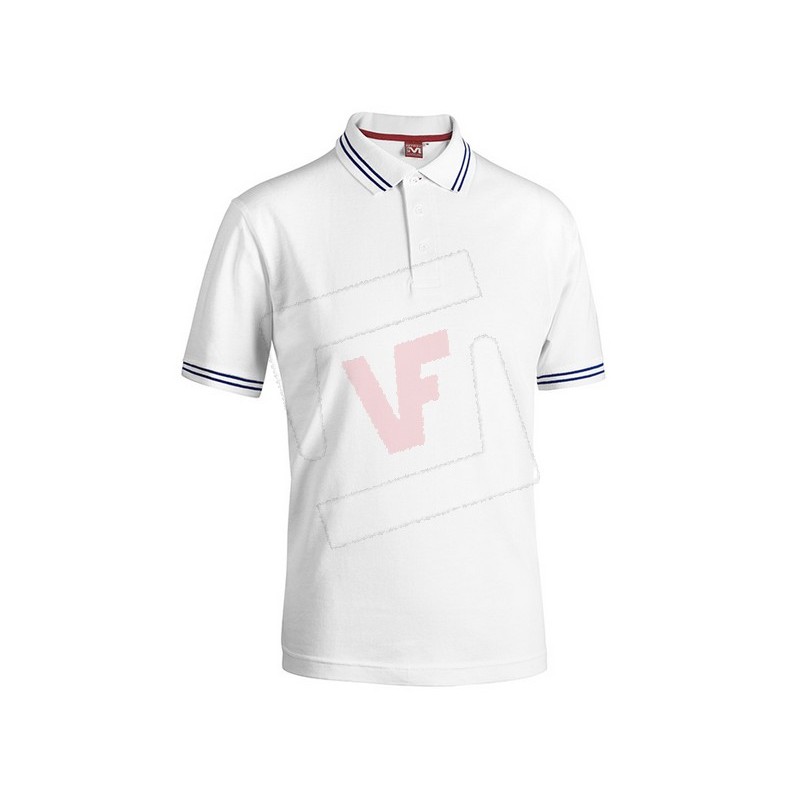 In 100% Piquet cotton, ribbed sleeve edge, side slit at the bottom, contrasting stripes on the collar and sleeve edge.
