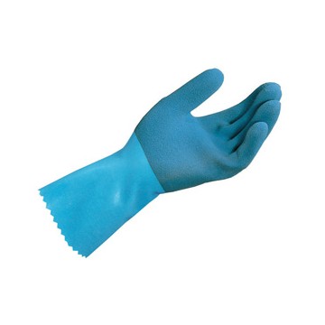 In natural latex, ideal for protection from liquids, excellent tear resistance. Internal textile support, external granite finish, scalloped sleeve, col. blue.