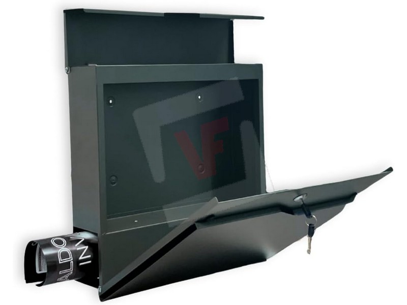In acciaio verniciato, design minimale e contemporaneo, completa di portagiornale e targhetta in acciaio inox, serratura a cilindro con 2 chiavi, mm. 370x105x370 h.