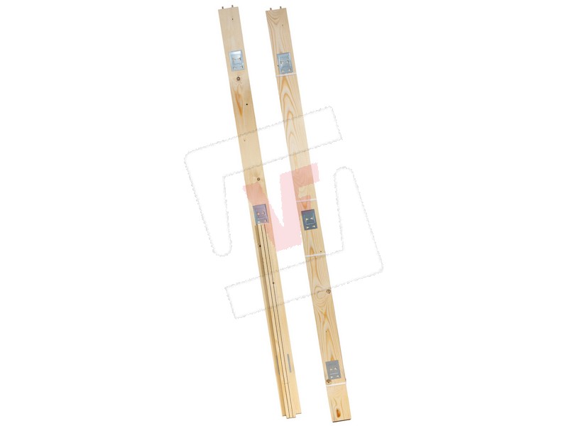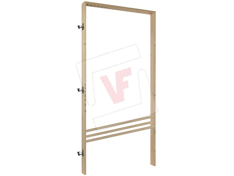 In legno di abete certificato PEFC, utilizzabile per 7 diverse larghezze di porte (max cm. 90), 6 zanche in lamiera di acciaio zincato, gancio metallico centrale che conferisce ulteriore sicurezza di muratura nel tempo, 3 distanziali in legno che assicurano elevata stabilità, assemblaggio facile, rapido e comodo, fornito completo, pronto per essere montato.