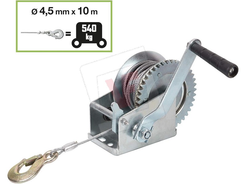 Cricchetto reversibile avanti/indietro e posizione di disinnesto, manovella mm. 200, tamburo Ø mm. 18, demoltiplicatore 4.1:1, forza di trazione kg. 540 (Kg. 1.80 con puleggia non inclusa), cavo in acciaio Ø mm. 4,5x10 mt.