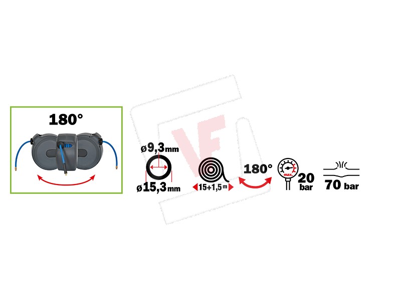 Tubo in pvc mt. 15, tubo di alimentazione mt. 1,5, raccordi maschi 1/4 pressati, ruota dentata con sistema di blocco automatico, avvolgimento automatico tramite molla a spirale, rotazione 180°.