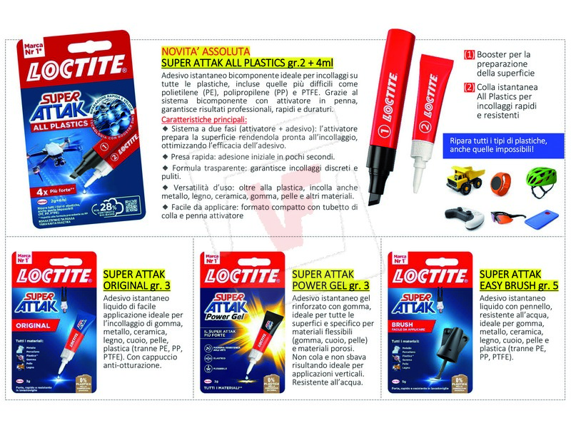 COMPOSIZIONE: 6 BLISTER, NOVITA ASSOLUTA colla Super Attak All Plastics gr. 2 + ml. 4, adesivo istantaneo bicomponente ideale per incollaggi su tutte le plastiche, incluse quelle più difficili come polietilene (PE), polipropilene (PP) e PTFE. Grazie al sistema bicomponente con attivatore in penna, garantisce risultati professionali, rapidi e duraturi. Caratteristiche principali: sistema a due fasi (attivatore + adesivo): lattivatore prepara la superficie rendendola pronta allincollaggio, ottimizzando lefficacia delladesivo, presa rapida: adesione iniziale in pochi secondi, formula trasparente: garantisce incollaggi discreti e