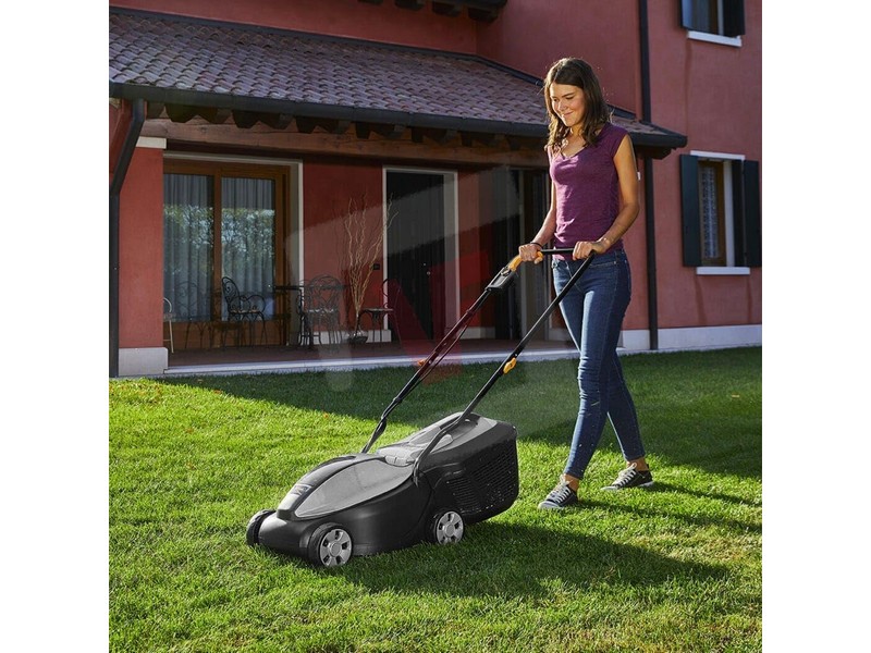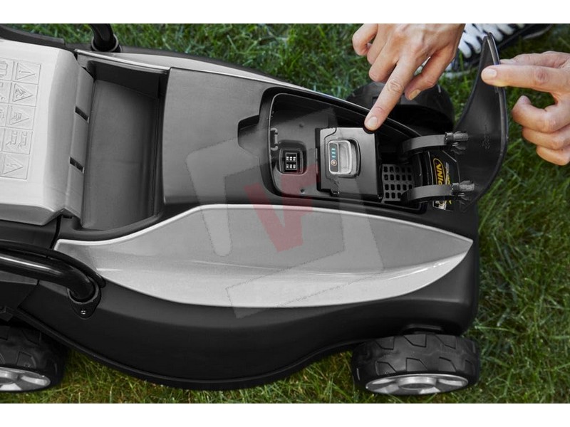 Scocca in polipropilene, batteria al litio 4,0 Ah, motore Brushless, caricabatteria, cesto di raccolta rigido, altezza di taglio centralizzata regolabile in 3 posizioni, manico ripieghevole.