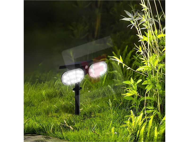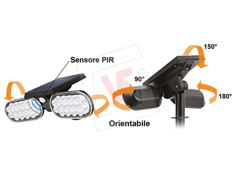 Corpo in ABS, installabile a muro o a terra, lampade e pannello orientabili, 32 led 0,2 W (200÷600 lumen), 2 modalità di luce: luce 100%, soffusa, autonomia max 12 ore, batteria integrata ricaricabile, protezione IP65, sensore di movimento, sensore crepuscolare, altezza max cm. 43.