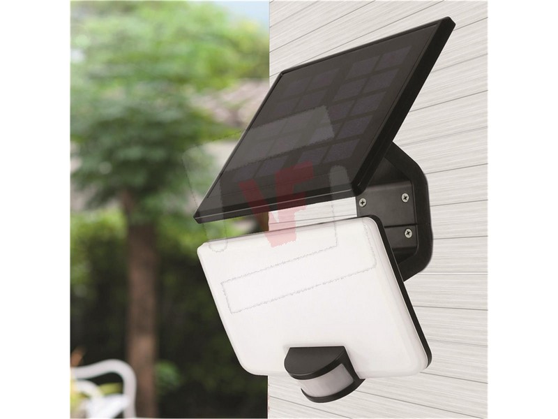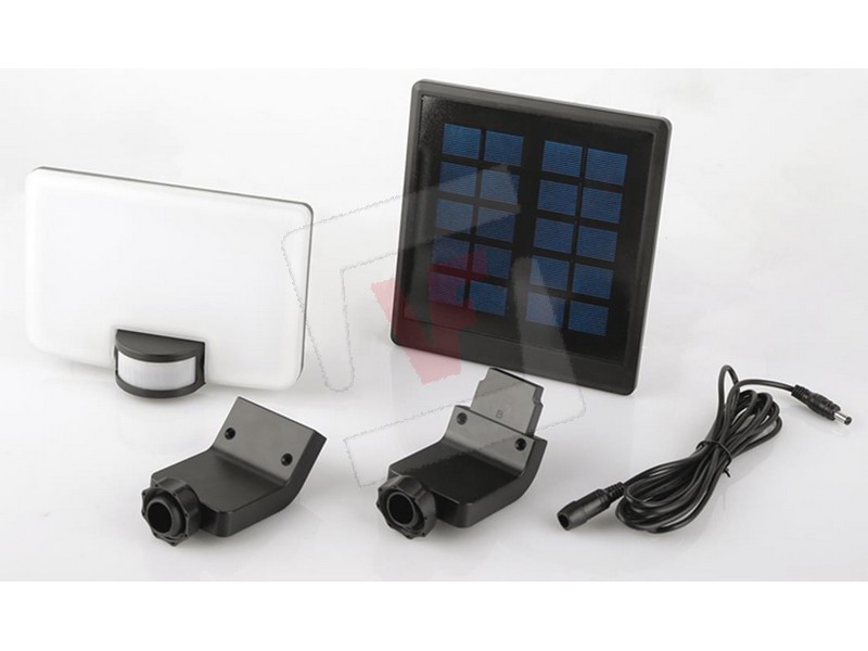 Corpo in ABS, orientabile, 82 led 8 W (max 800 lumen), luce naturale (4.000° K), autonomia max 18 ore, batteria integrata ricaricabile, protezione IP54, sensore di movimento, angolo di rilevamento 110°, distanza rilevamento mt. 10, luce soffusa o spenta in assenza di movimento, luce accesa per 10-60 secondi al rilevamento del movimento, sensore crepuscolare, accessori di montaggio inclusi, cavo di collegamento pannello mt. 3, dimensioni cm. 17,8x14x29 h.