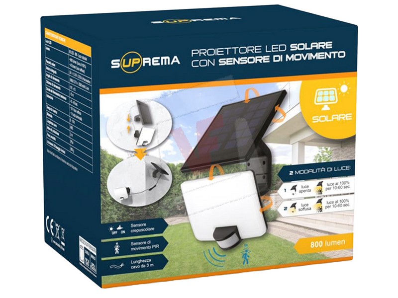 Suprema PROIETTORE SOLARE CON PANNELLO ORIENTABILE, 82 led, 8 watt, 40-800 lumen, luce naturale