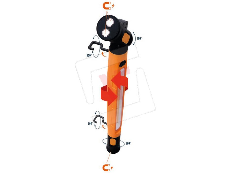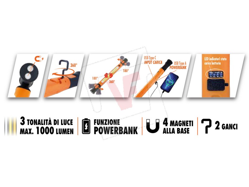 Corpo in robusto ABS, policarbonato e gomma siliconica, luce frontale COB-LED 16 W (max 1.000 lumen), 3 tonalità di luce: fredda, calda, naturale. Angolo illuminazione 120°, funzione powerbank, autonomia max 3 ore, 4 magneti alla base, 2 ganci appendini, batteria al litio ricaricabile, protezione IP20, resistenza agli urti IK04, cavo di ricarica USB incluso, Ø cm. 4,7x51 h.