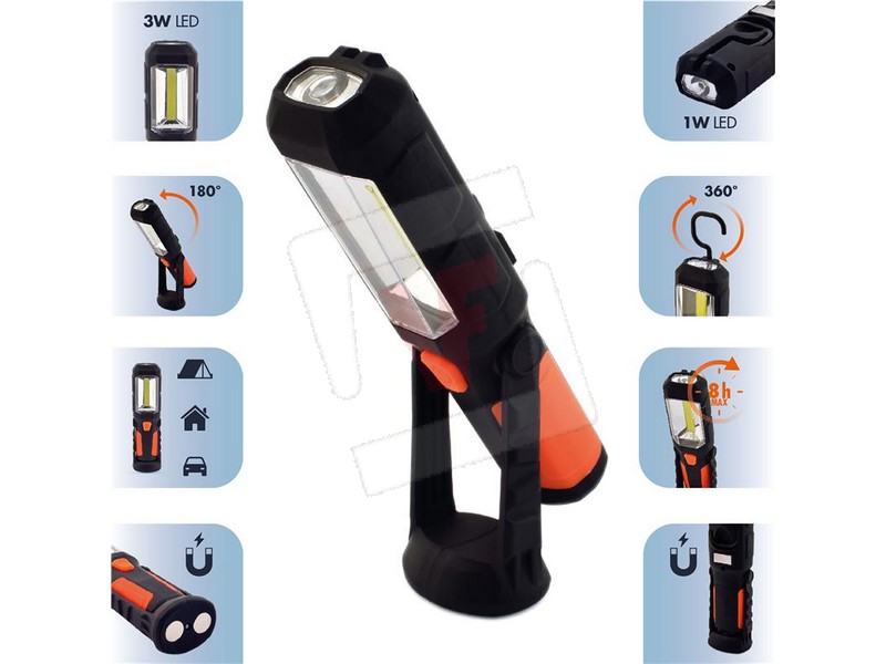 Corpo in robusto ABS e gomma, luce frontale COB-led 3 W (240 lumen), torcia SMD led 1 W (50 lumen), autonomia max 8 ore, gancio a scomparsa, 2 magneti, base regolabile, cm. 5,5x5x22 h. Funziona con 3 batterie ministilo (non incluse).