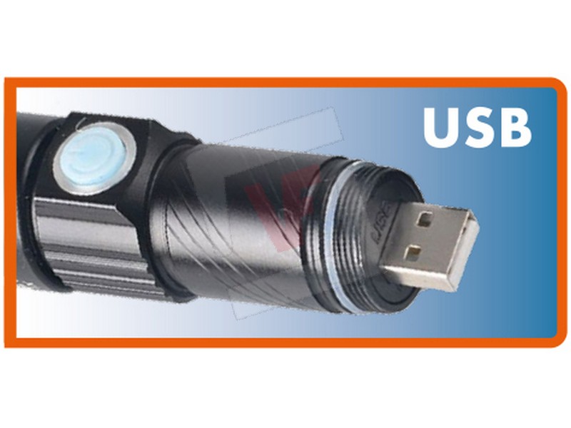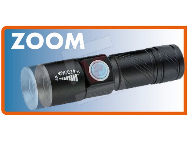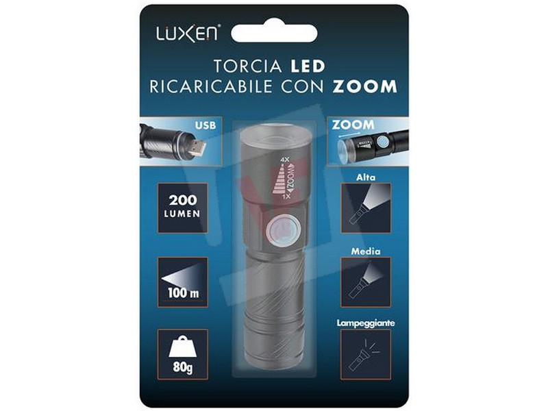 Leggera, compatta e tascabile, led 3 W (200 lumen), 3 modalità di luce: alta, media, lampeggiante. Illumina fino a mt. 100, funzione zoom, autonomia max 5 ore, batteria al litio ricaricabile, ricarica USB, cinturino incluso.