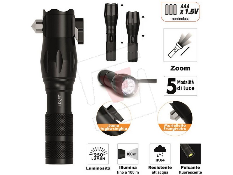 Professionale, corpo in alluminio, resistente, compatta, potente ed impermeabile (IPX4), luce bianca, led 5 W (250 lumen), 5 modalità di luce: alta, media, bassa, strobo, segnale SOS. Angolo illuminazione da 60° a 120°, illumina fino a mt. 100, funzione zoom, martelletto frangi-vetro e lama taglia-cinghia, impugnatura con grip anti-scivolo, funziona con 3 batterie ministilo (non incluse), Ø cm. 4x14 h.