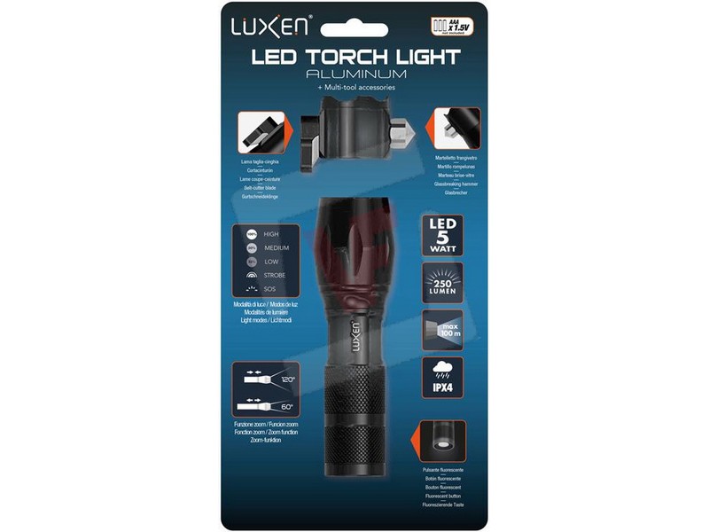 60563 | Luxen TORCIA IN ALLUMINIO+ LAMA TAGLIACINGHIE E MARTELLETTO, 5 W, 250 lumen, 5 modalità di luce+zoom || |