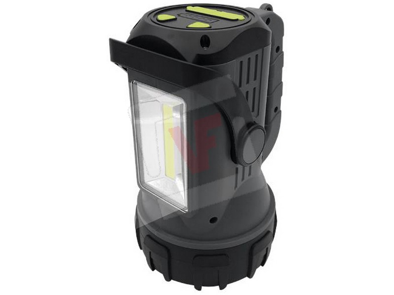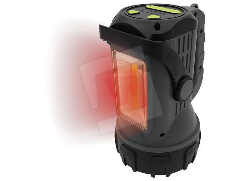 Corpo in robusto ABS, luce frontale bianca 5 W (250 lumen) con 4 modalità di luce: alta, media, bassa, flash. Luce laterale bianca/rossa 5 W (350 lumen) con 6 modalità di luce: alta, media, bassa, rosso fisso, rosso lampeggio, rosso strobo. Funzione powerbank con indicatore di ricarica, autonomia max 48 ore, batteria al litio ricaricabile, impugnatura ergonomica, maniglia regolabile per il trasporto, cavo di ricarica USB incluso, cm. 20,5x14x12,5 h.