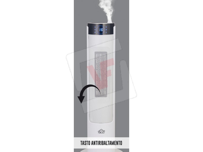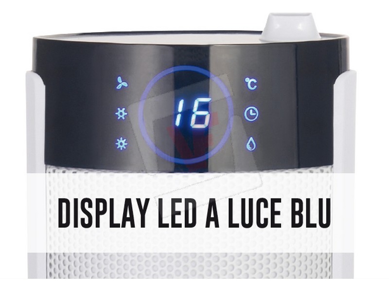 Display a led con luce blu, elemento riscaldante in ceramica, umidificatore ad ultrasuoni, termostato regolabile, temperature impostabili da 10° a 35° C, tanica da lt. 2,5, funzione ventola tiepido/caldo, ampia oscillazione, sistema di sicurezza anticaduta, protezione dal surriscaldamento automatica, timer da 12 ore, completo di telecomando, solida base Ø cm. 26x26, altezza cm. 74,5.